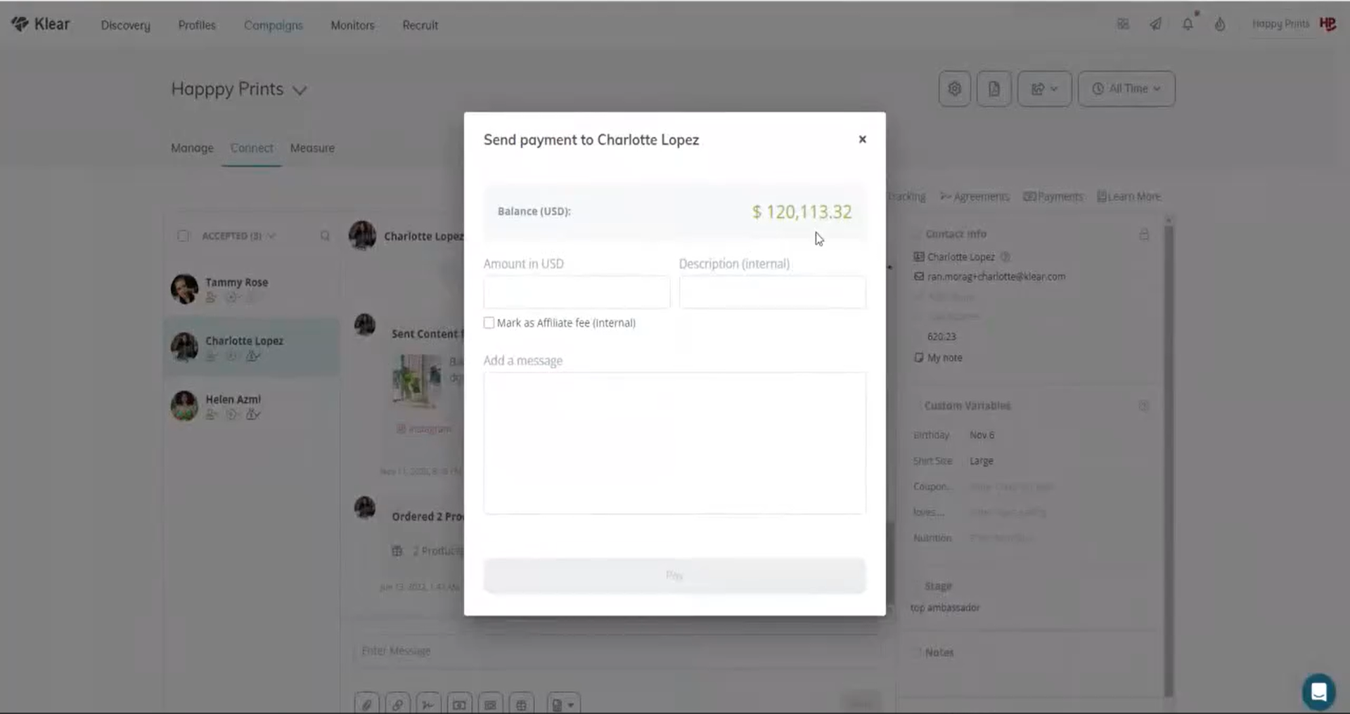 Klear customers can also pay their influencers by navigating to Measure > Affiliates and locating the influencer they'd like to pay. From this page, any money owed to the influencer can be paid by clicking the "Pay" button in the "Owed" column.