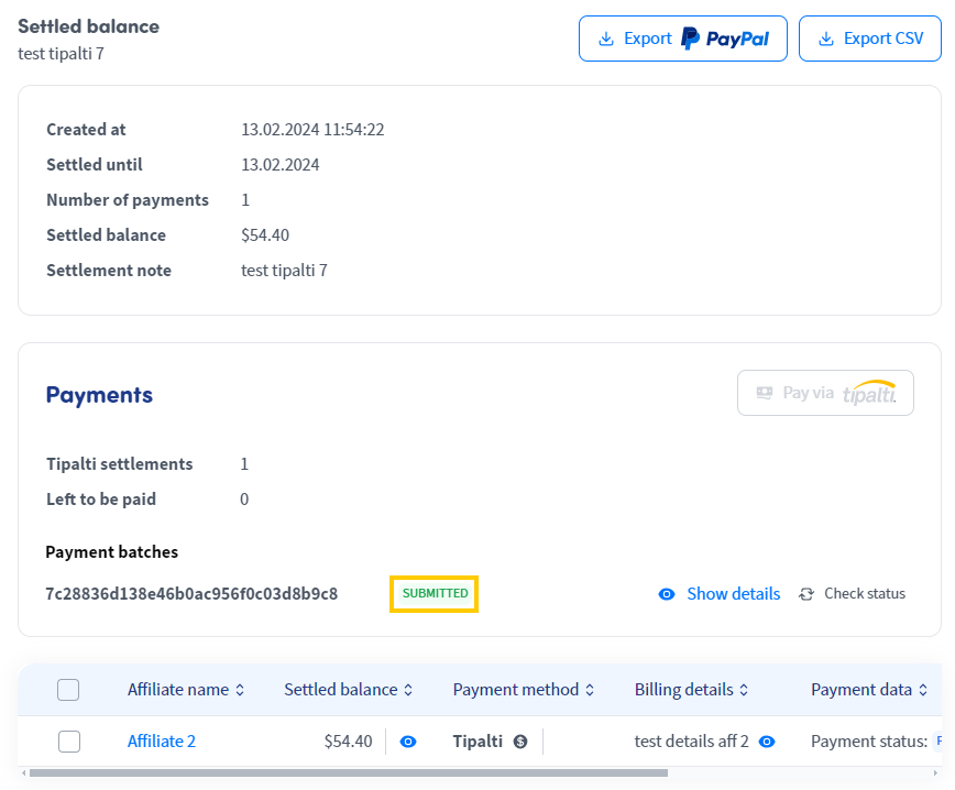 If the payment has already been submitted, the "Pay via Tipalti button" will be greyed out . After clicking a row on the "Settlements" page, you can view details about the payment record, which includes the Affiliate name, settled balance, payment method, and payment status.