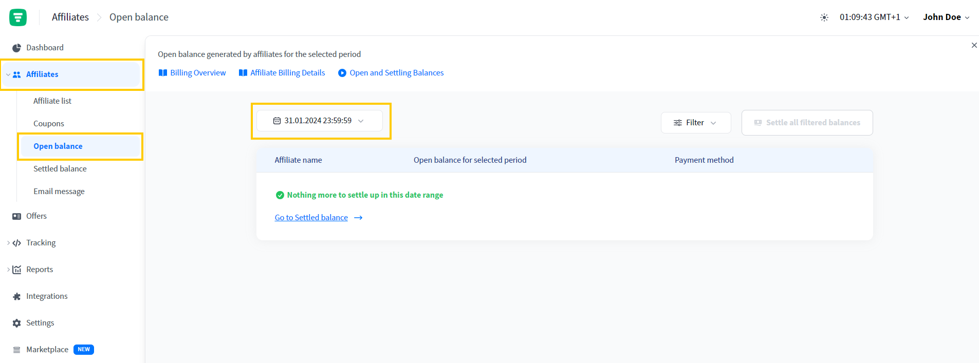 In Trackdesk, go to Affiliates > Open balance and select your date range.