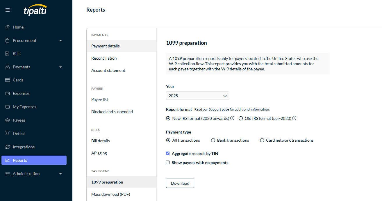 Select the same format you would use when downloading for 2020. If you’re using the "New IRS format (2020 onwards)", please take into account that the payments will be mapped to the correct boxes, but box numbers will have changed.