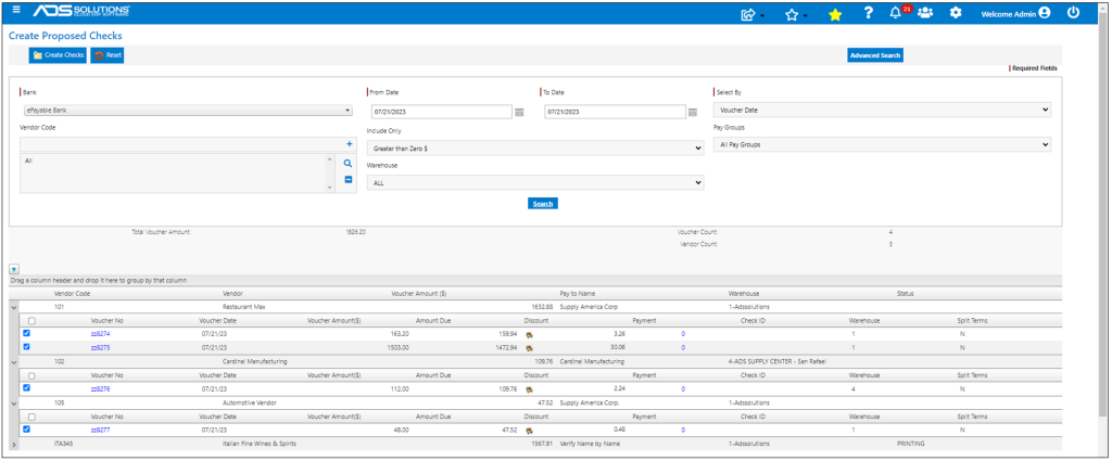 Then select which Vouchers to pay and click Create Checks