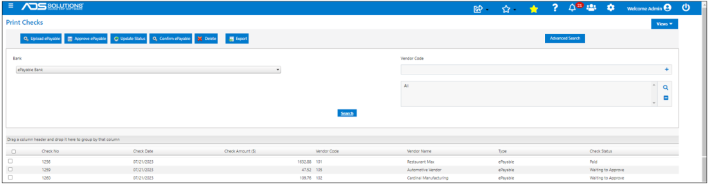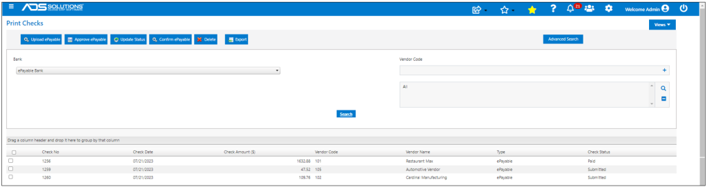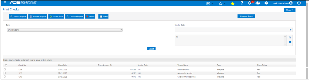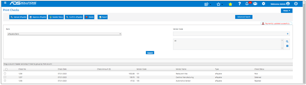 Once Confirmed, checks show up in Accolent ERP on the List Checks screen with the Type of ePayable Check