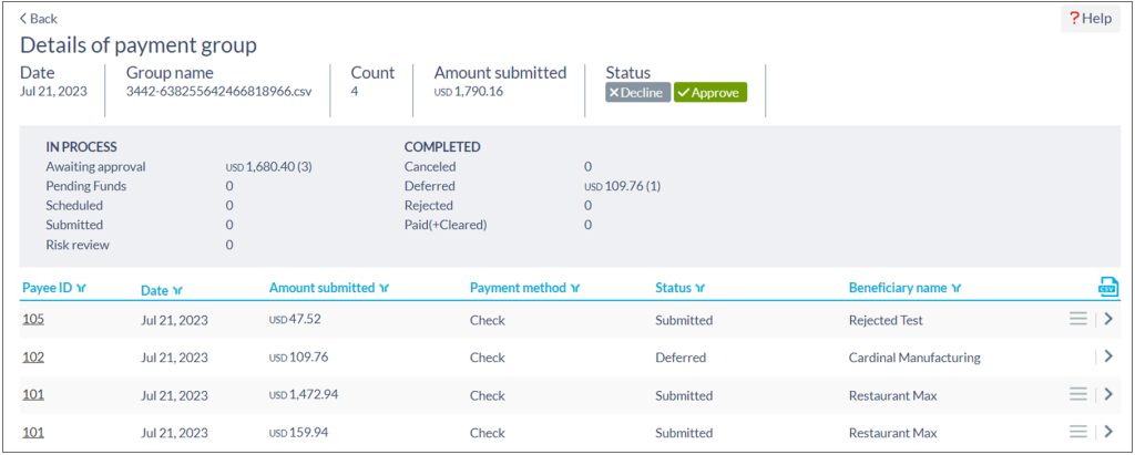 If the Payee is not “Payable” in Zipalti (e.g., if Vendor has not set up its payee information), the status will change to “Deferred” as for Check 1257 for Vendor 102