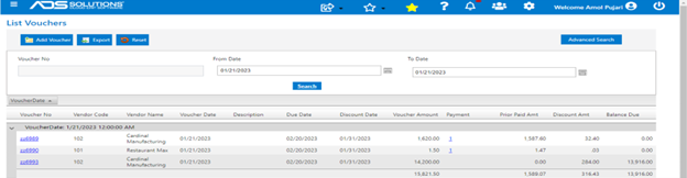 In Accolent ERP, go to Payables > Vouchers > List Vouchers > Add Voucher