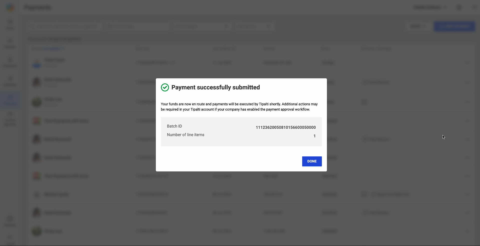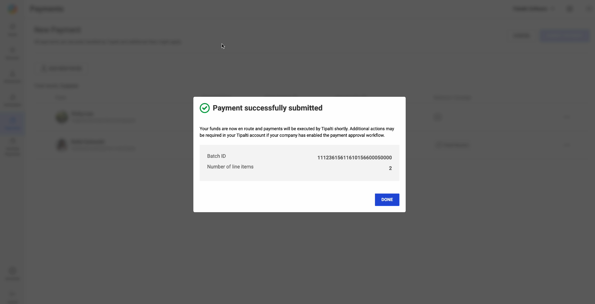 - Once completed loading, a dialog appears showing that the payments were successfully sent to Tipalti.