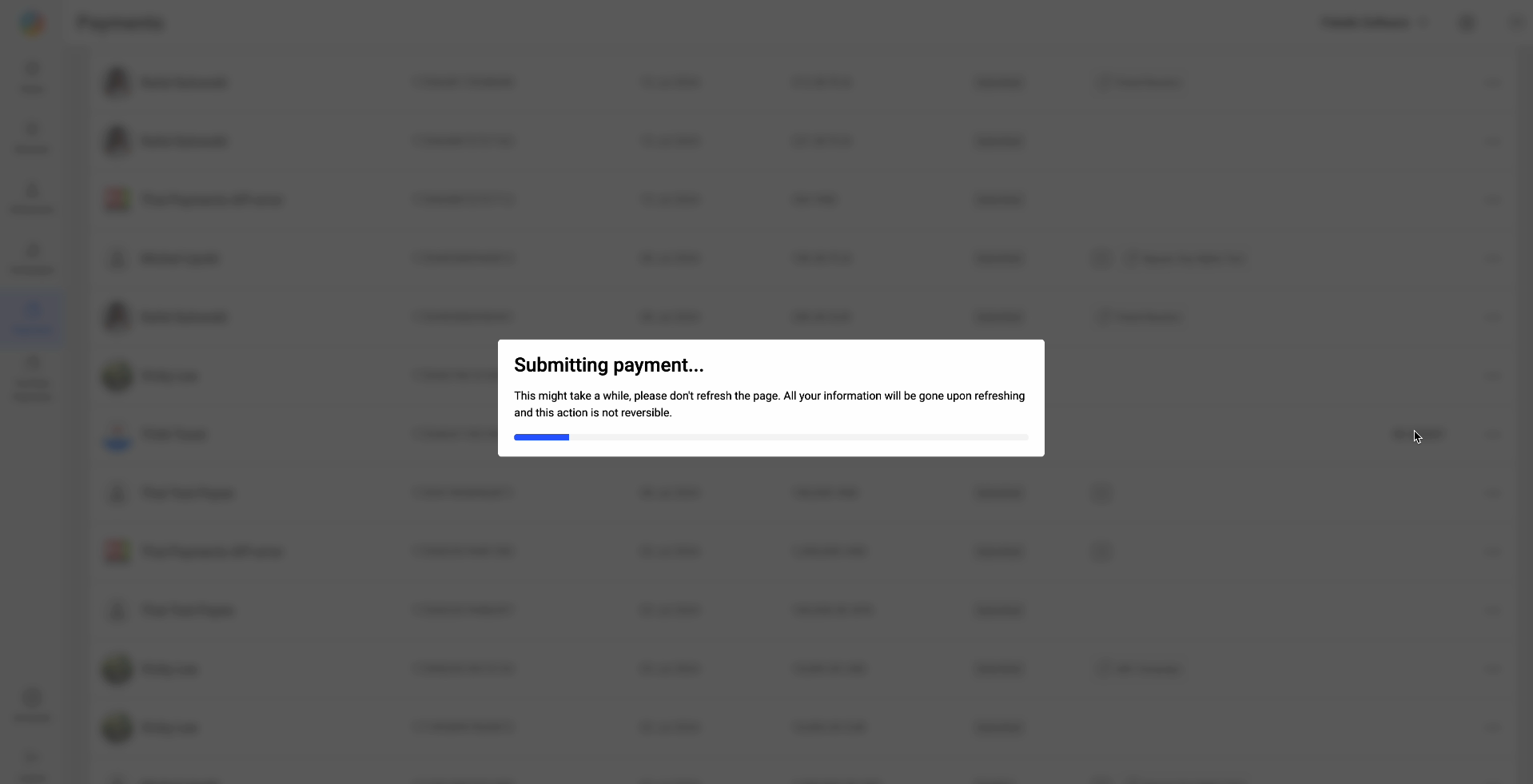 - Click the "Submit Payment" button to submit payments to Tipalti. A blue loading bar appears.