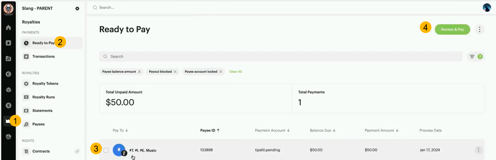 From the Payments section, click Ready to Pay, which displays all unpaid balances that can be paid to the artists/payees.