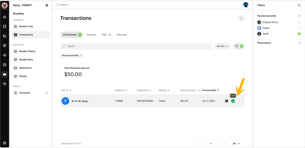 Payment statuses update in Revelator on the Transactions page. Statuses are as follows: Pending, Paid, Returned.