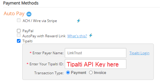 In the Payment Methods section, select Tipalti for the payment method. Enter the Tipalti Payer Name and TipaltiID (the API key provided to you in the Tipalti Hub). To capture the API key navigate to Administration> Integrations> API keys from within the Tipalti AP Hub. Next, choose Payment or Invoice as your Transaction Type.