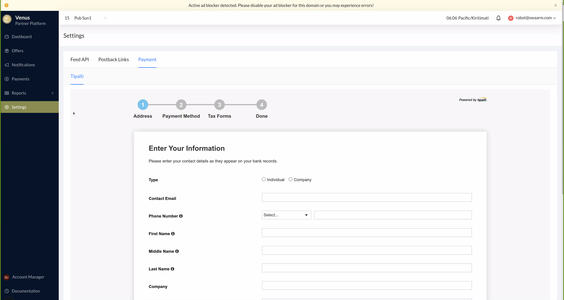 In Swaarm’s Partner Platform, publishers will navigate to Settings > Payment > Tipalti which will initiate the Tipalti Setup Process iFrame.