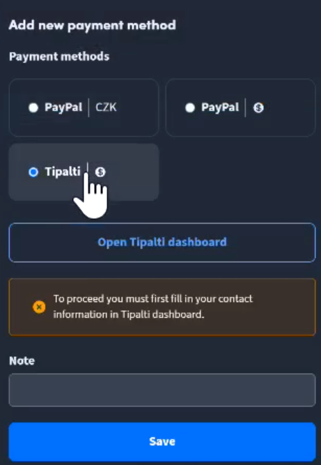 Select "Tipalti" as the payment method and click "Open Tipalti dashboard" to complete the onboarding process.