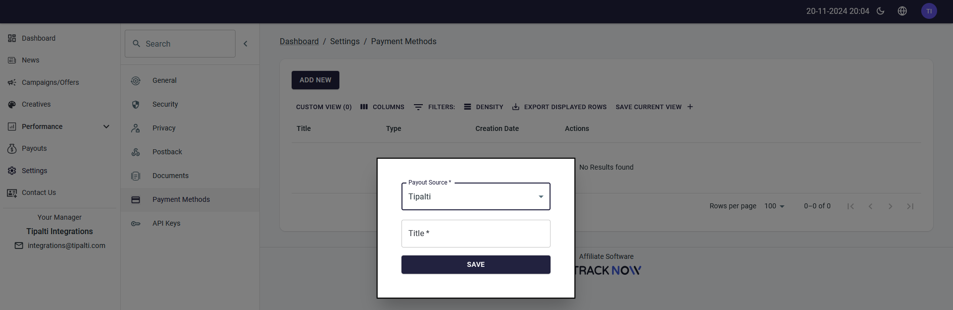 A modal appears asking for a Payout Source and Title. Select Tipalti from the Payout Source dropdown. Add any Title you want, then click Save.