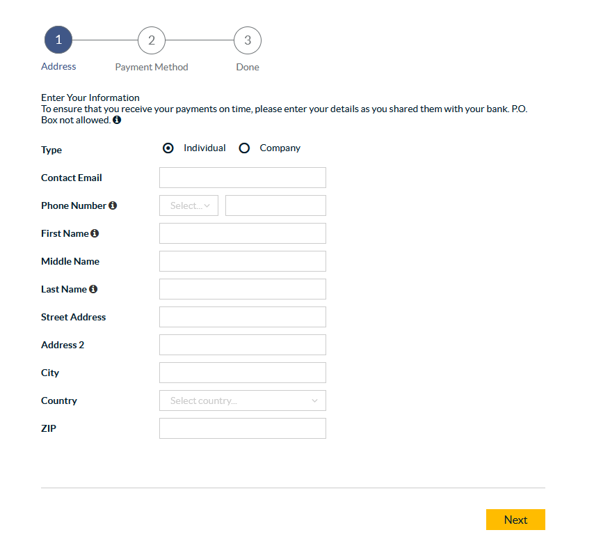 The Tipalti iFrame is opened in a pop-up window. You may need to allow pop-ups from Tracknow to see the iFrame pop up window. Complete the fields in the iFrame.