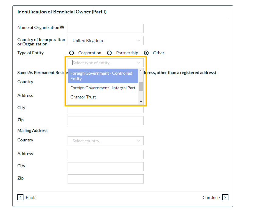 Line 4: Has changed from "Government" to "Foreign Government - Controlled EntityAn entity can be a subsidiary, division, business unit, brand, etc. of your organization. Entities can have similar or different AP processes and workflows." and "Foreign Government - Integral Part"