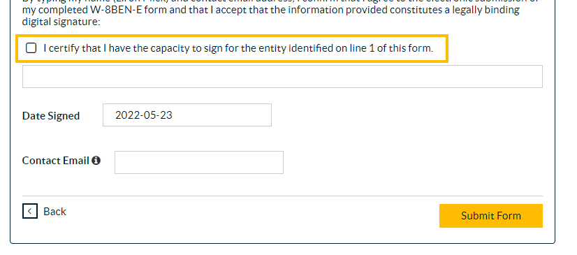 Moved the check box above the signature line: "I certify that I have the capacity to sign for the entity identified on line 1 of this form"