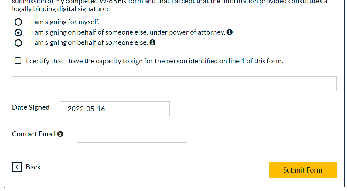 The new check box ("I certify that I have the capacity to sign for the person identified on line 1 of this form") will open only if the payees are signing on behalf of someone else, and in this case, supporting documentation will be required as specified here: