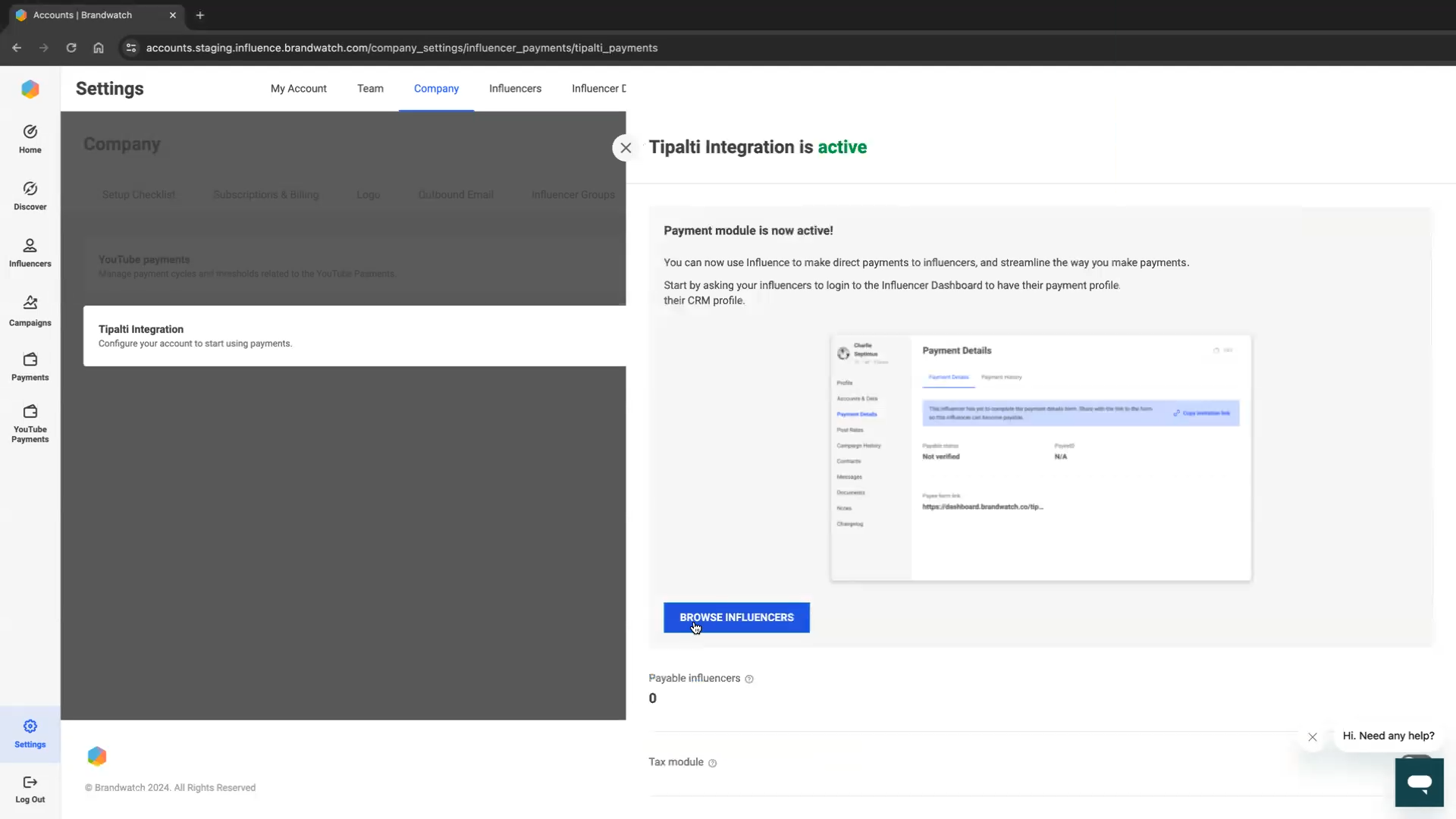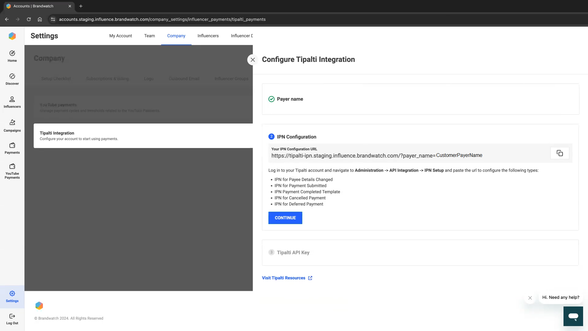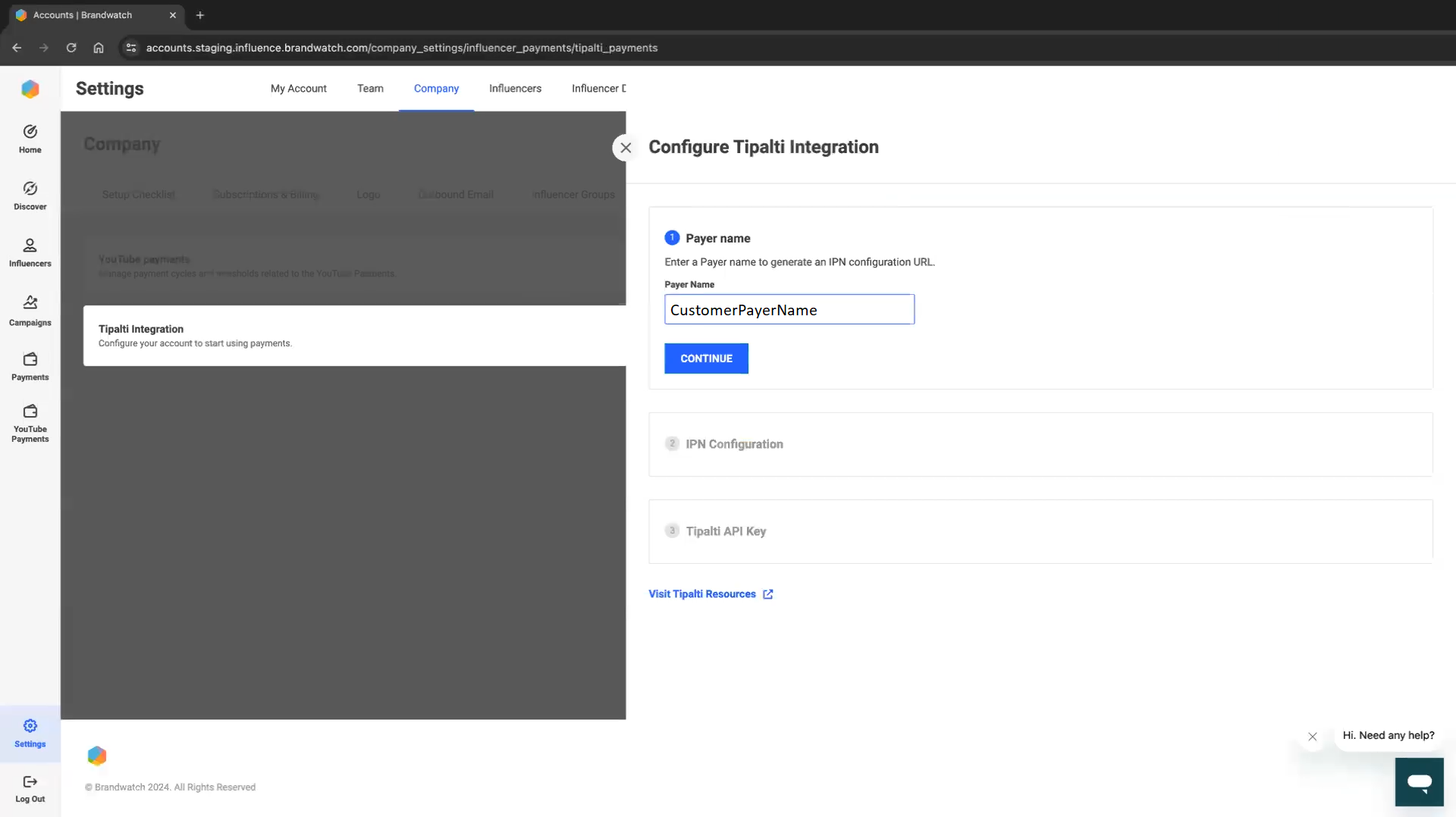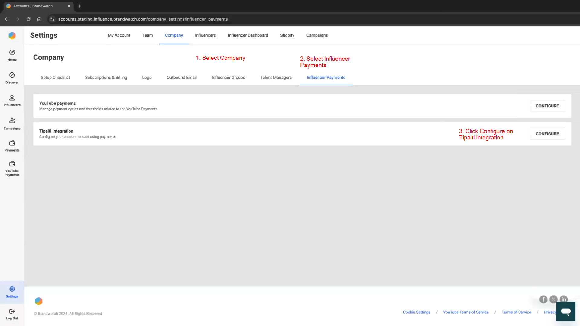 Go to Company > Influencer Payments and click the "Configure" button for the Tipalti Integration.