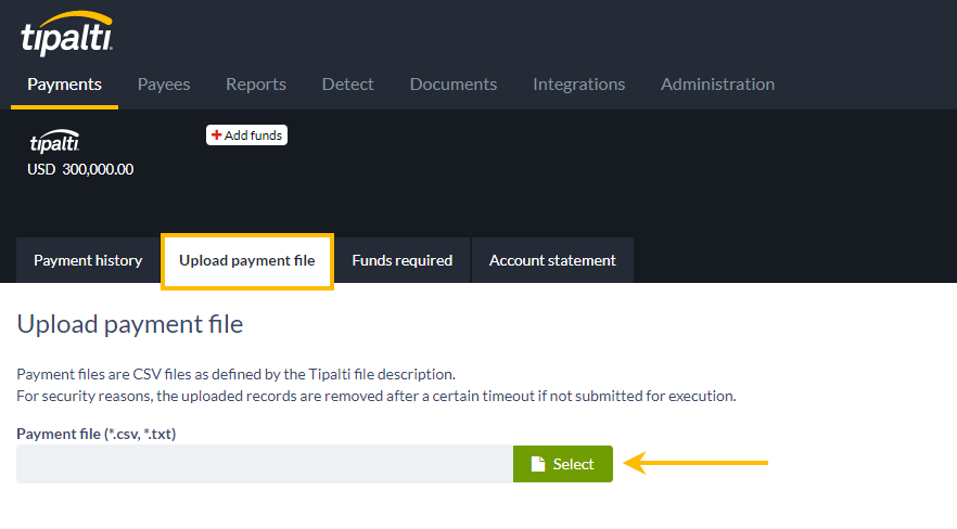 - Go to Payments > Upload payment fileA CSV or TXT file that contains one or more payment orders/ instructions to Tipalti. It can be submitted via the Tipalti Hub or Tipalti's FTP path..