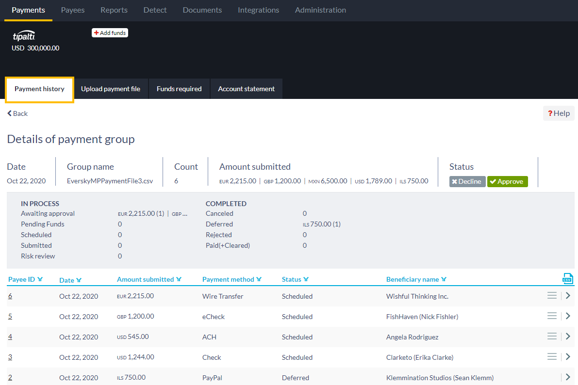 - Click "Submit", which creates a payment group in Tipalti. You can review details of the payment group on the "Payment history" subtab.
