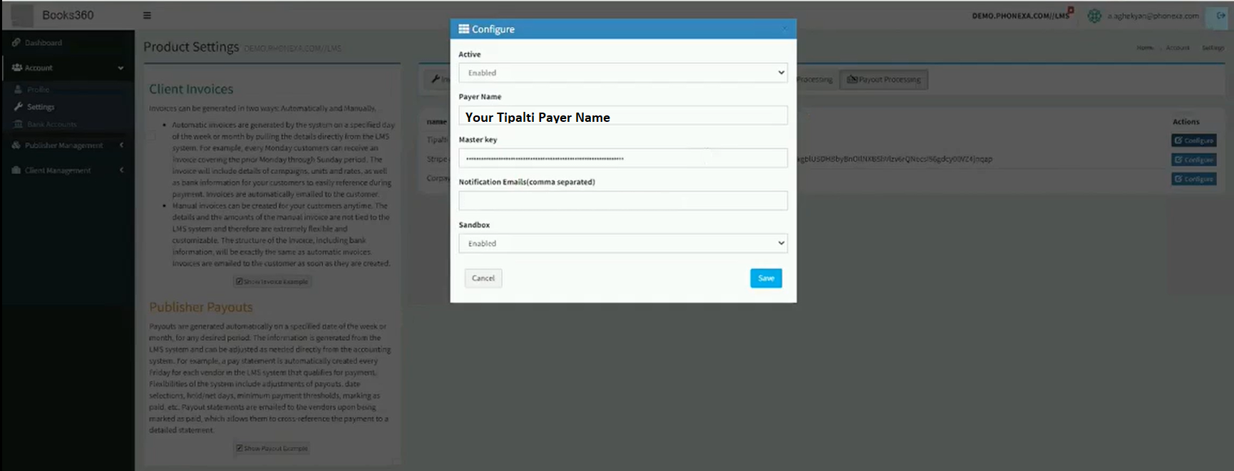 Under Configure, enter your Tipalti Payer Name, API Key, and set the email addresses for receiving Phonexa notifications. This is also where you set if to use Sandbox or Production integration with Tipalti. Set Sandbox to Disabled for Production.