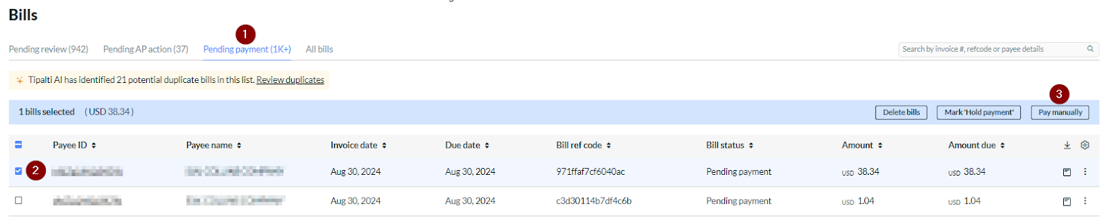 If you've paid a bill outside of Tipalti, marking it as “paid manually” ensures it is removed from your list of Pending Payment bills, preventing any accidental double payments. No funds will be sent from your Tipalti account to the payee.