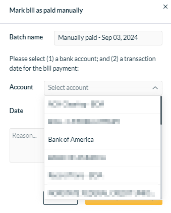 7. Choose the bank account that you used to pay the bill outside of Tipalti. For example, we chose Bank of America in the image below.
