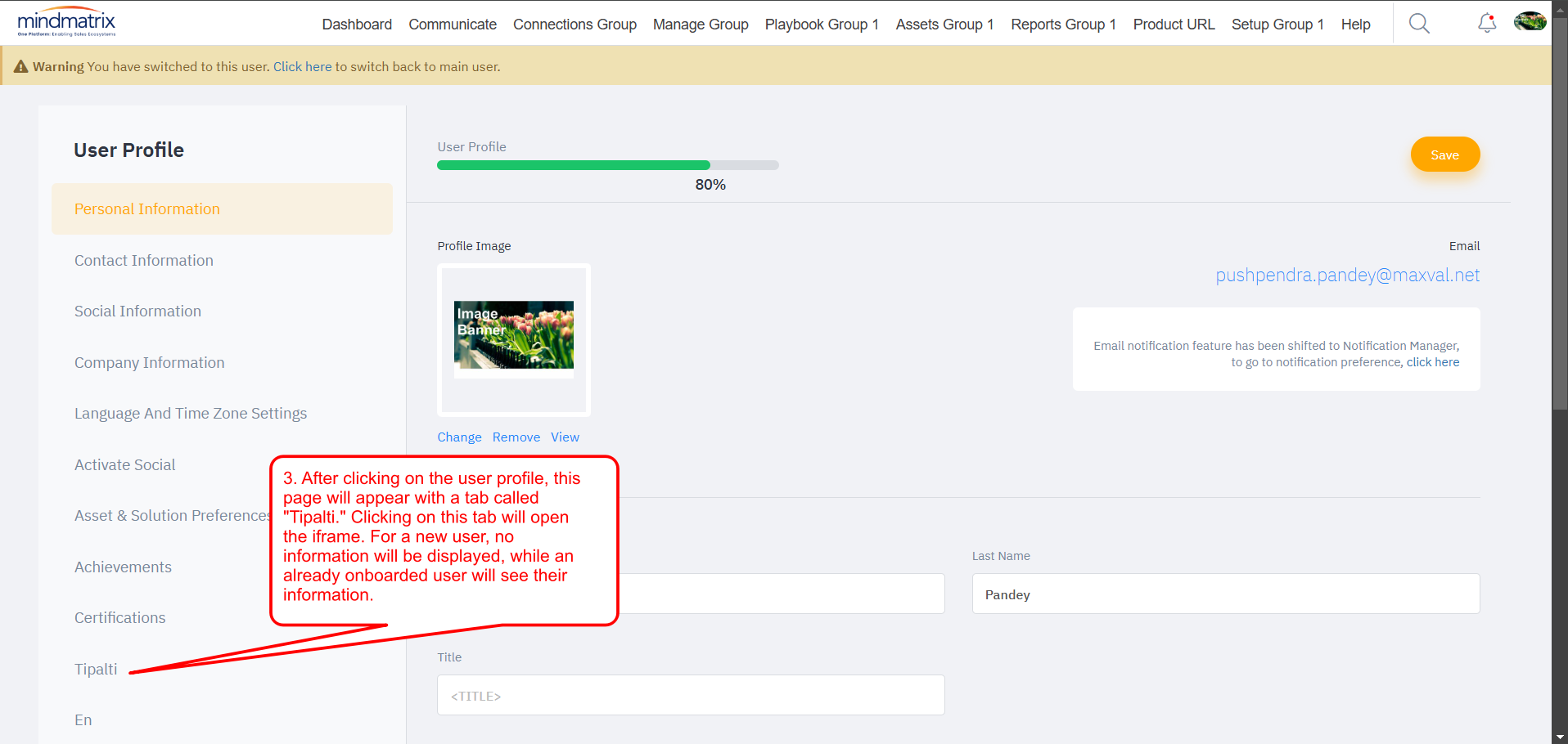 The Profile windows shows multiple options. Select Tipalti from the left side navigation.