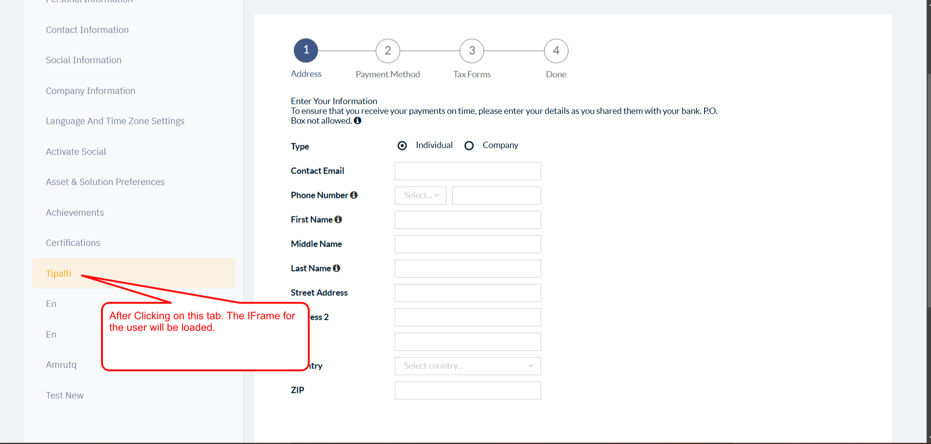 After clicking the Tipalti option, the Tipalti iFrame opens on the right side pane.