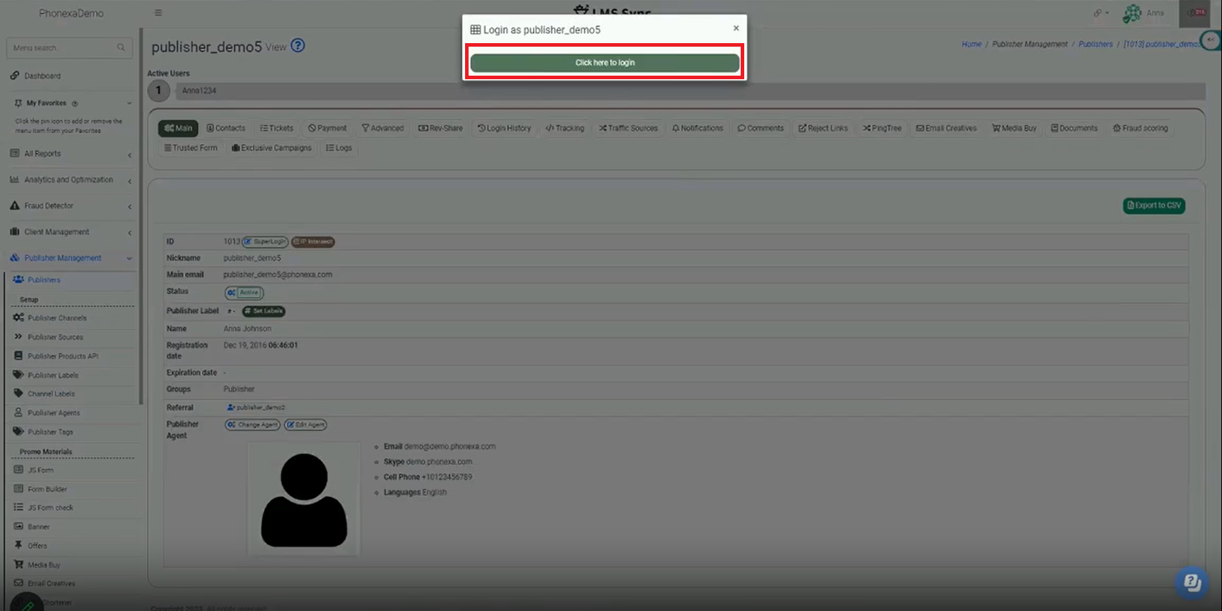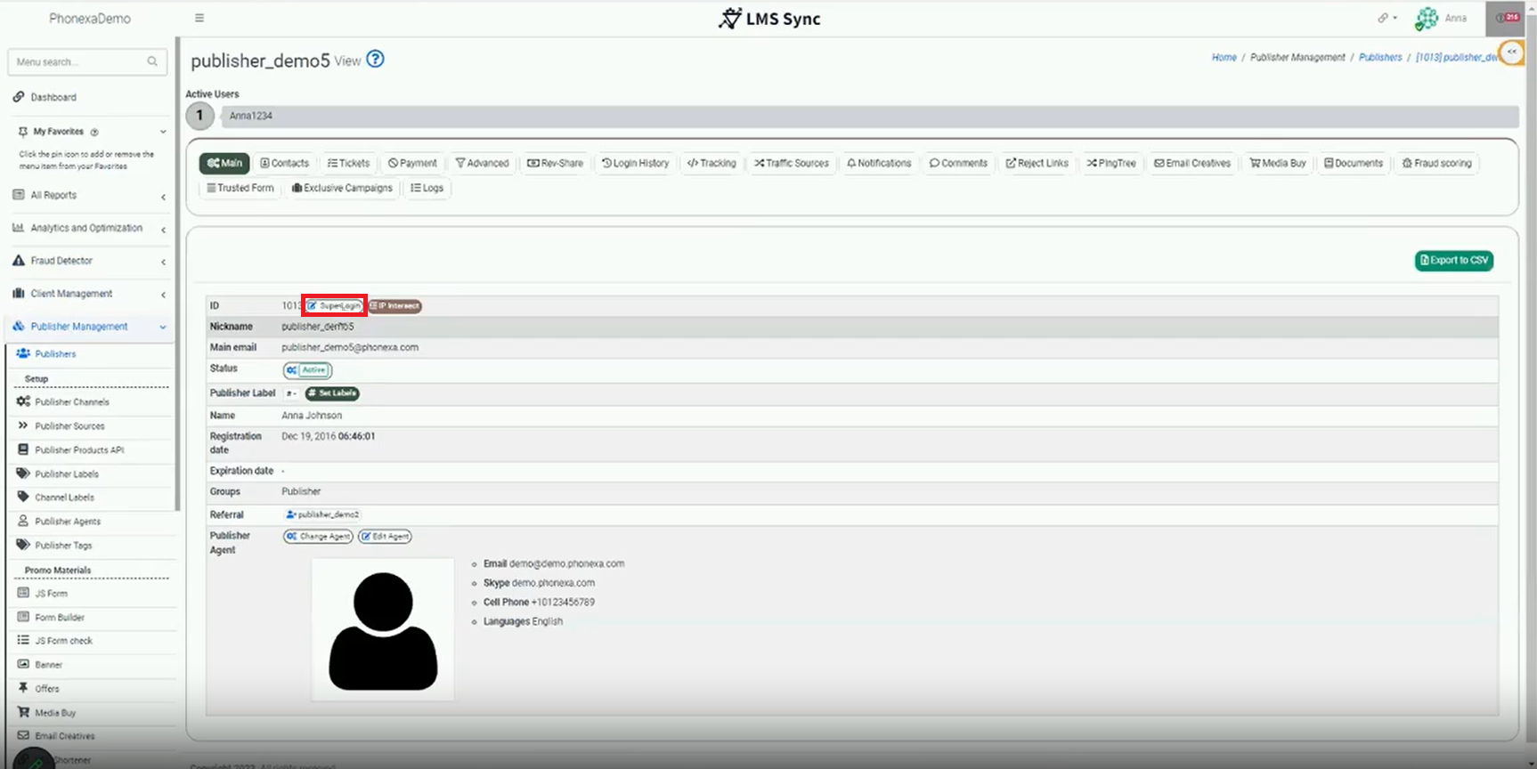 From the publisher view, click the SuperLogin button next to the ID.