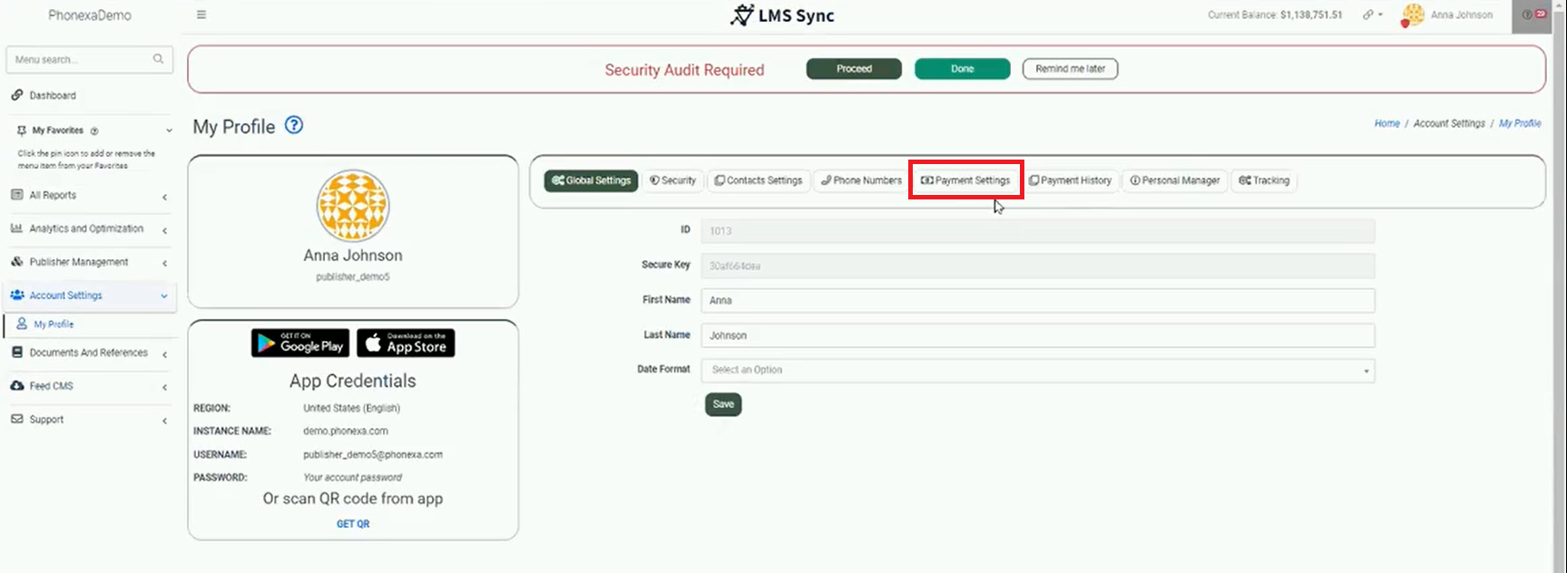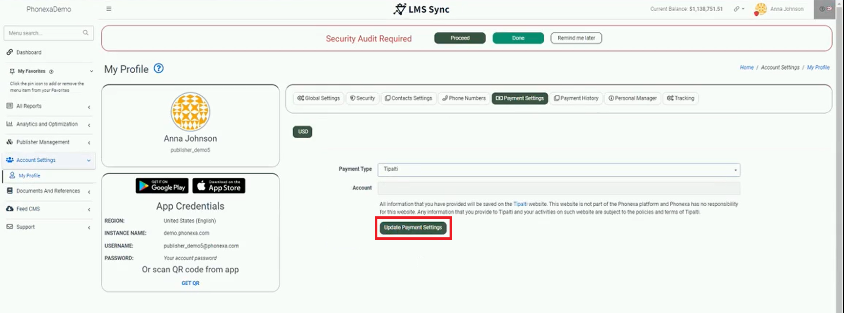 The page reloads and is displayed as below. Click the Update Payment Settings button to launch the Tipalti iFrame.