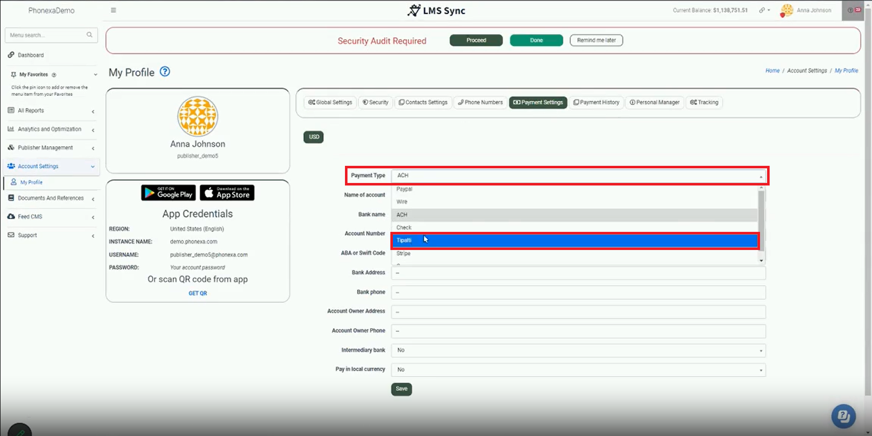 Select Payment Type and choose Tipalti from the dropdown.