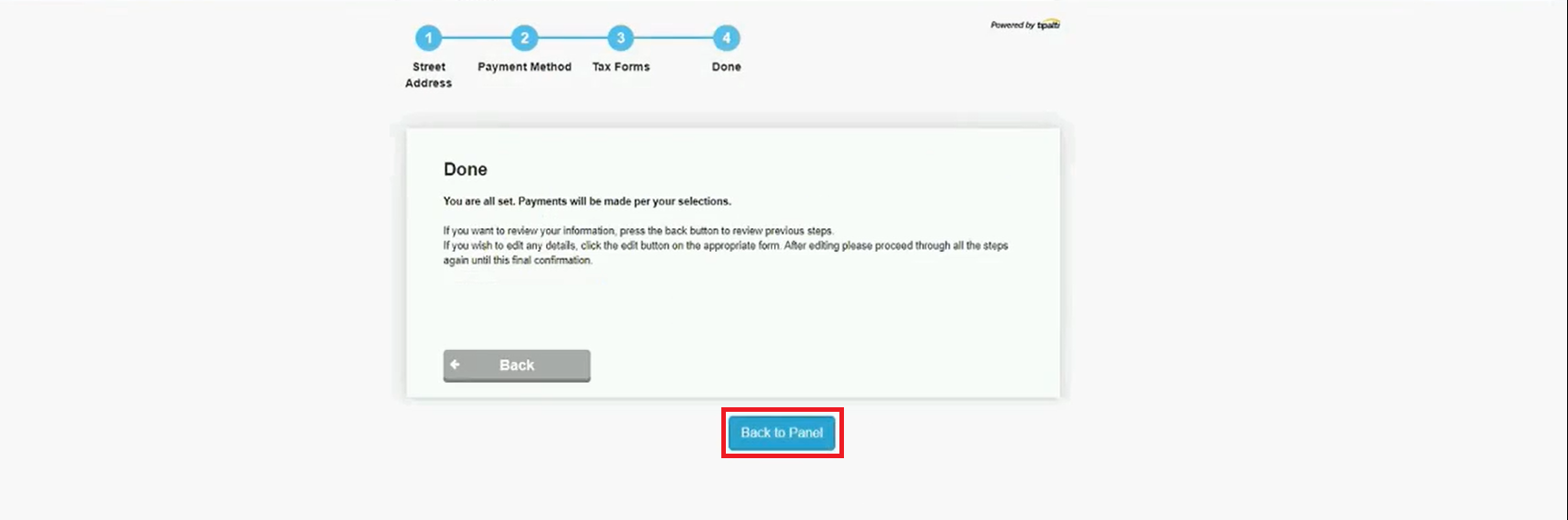 After completing the Payment Details iFrame, click Back to Panel to return to Phonexa.