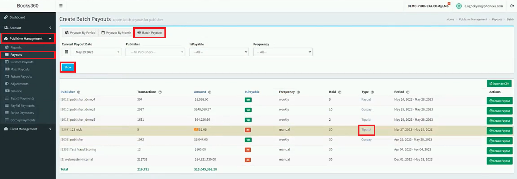 In Books360, go to Publisher Management > Payouts > Batch Payouts > Show. The Type column now displays Tipalti as the Type of payment method for this publisher.