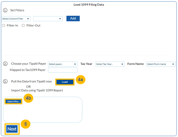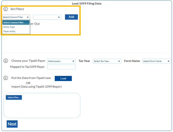 - Navigate to Import > Tipalti screen to open the "Load 1099 filling Data" wizard.
