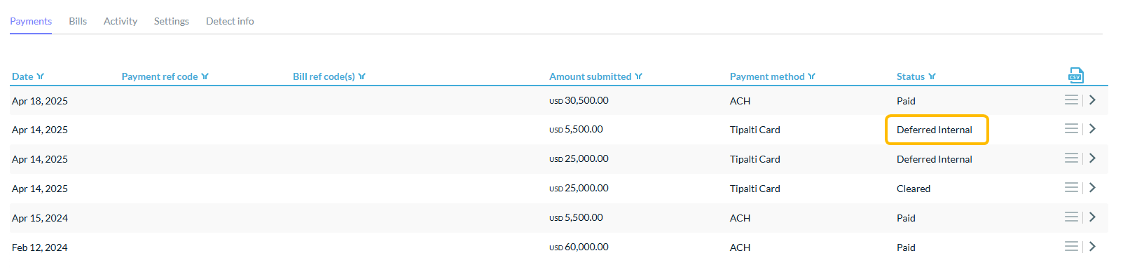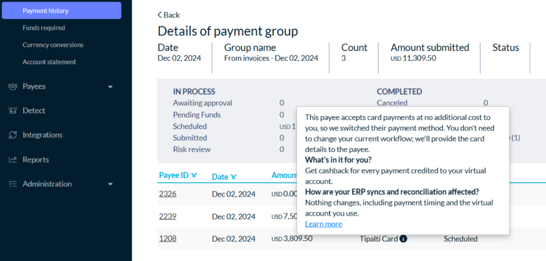 After a payment is processed, Tipalti Card appears as the payment method. These payments will sync to your ERP like any other bill payment processed via Tipalti.