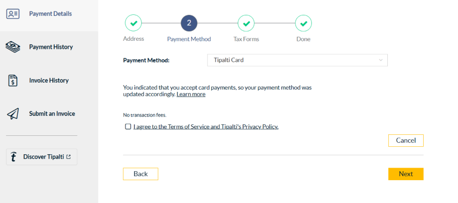 After eligible payees log into the Supplier Hub, they’ll see that their payment method was changed to Tipalti card, and if needed, they can change it back to the previous method, such as ACH/ wire, via the dropdown.