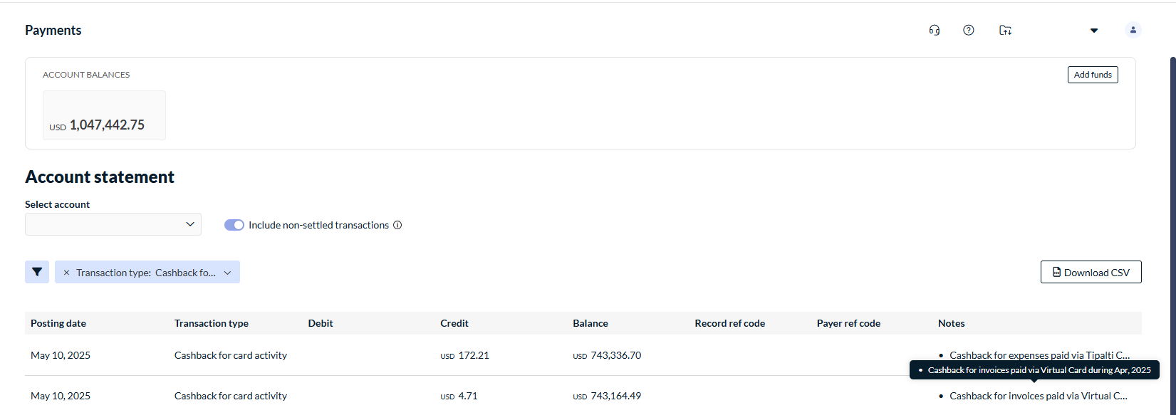 Cashback transactions are shown on the Account Statement page. Cashbacks are paid in an aggregated amount for all earnings from the previous month.