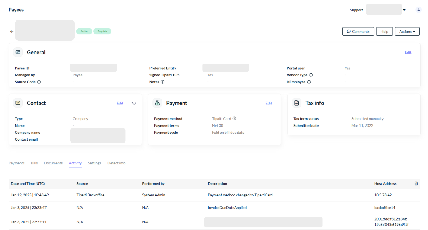 To check if a payee’s payment method was changed to ‘Tipalti Card’, the payer needs to check the Payment section on the payee profile. Additionally, on the payee’s Activity tab, you can see when and who performed the change in payment method. On the payee’s Activity tab, the Source column shows Tipalti Backoffice and the Performed by column shows System Admin.