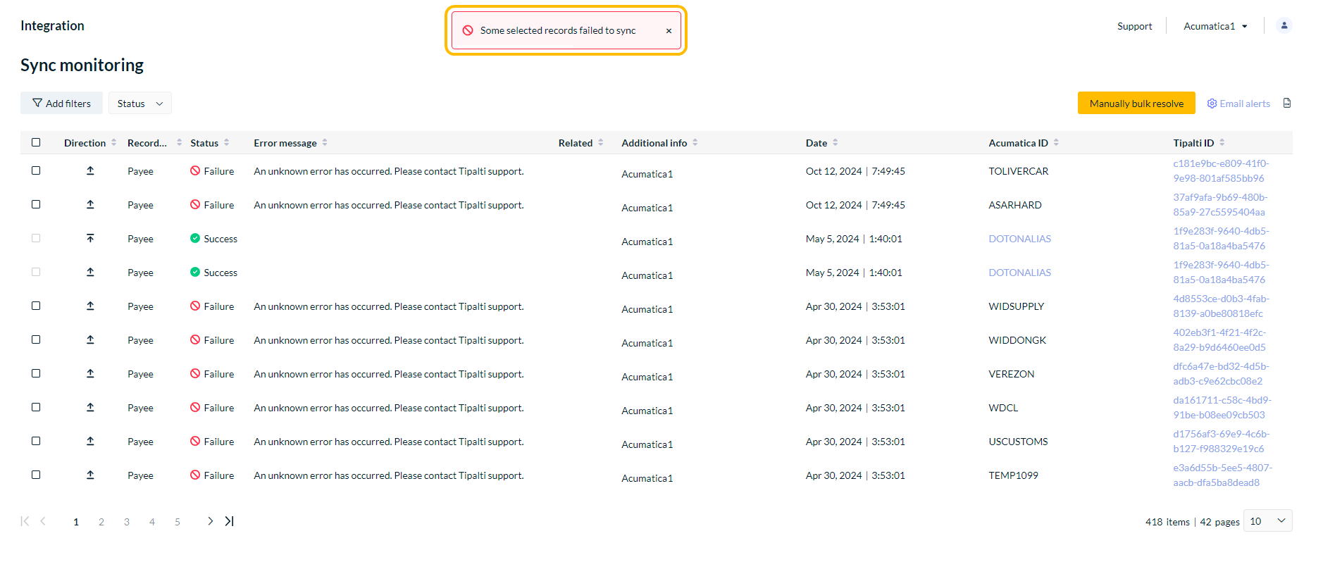 Navigate to the page to resolve the sync error (in Acumatica or Zipalti).